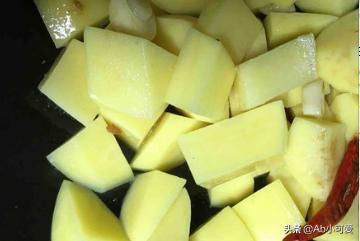 4、接着往锅中放入切好的土豆块,翻炒均匀,如下图所示。