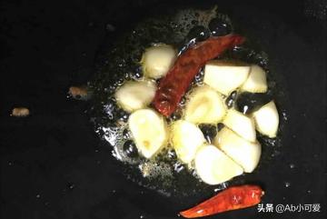 3、油锅热油,蒜瓣和干辣椒入锅翻炒,如下图所示。