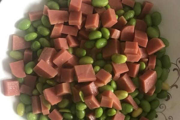 1、毛豆清洗干净,青红椒切成菱形状,火腿肠切丁,葱切段