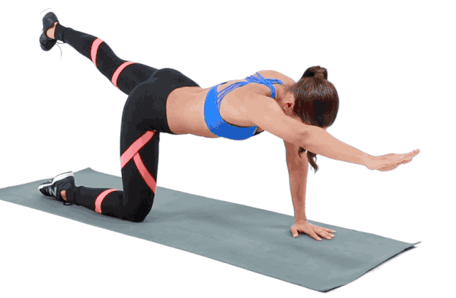 做法:双膝跪地,大小腿呈90度,双手掌在肩部正下方,吸气,同时抬高右腿向上向后,左手向前,呼气,收回到起始位置,动态练习20次,然后换另一侧的练习,动态练习20次,重复2组。