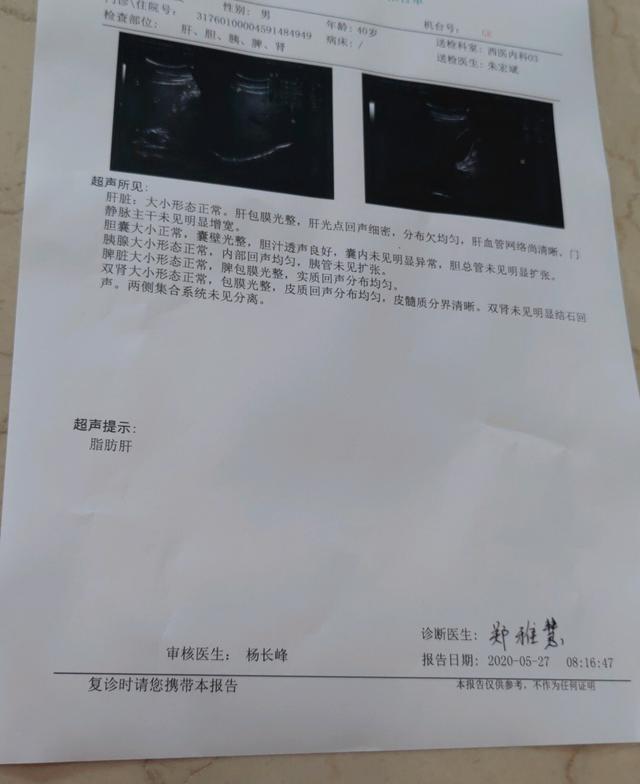 今天又来检查…做B超检查:肝、胆、胰、脾、肾。报告显示都正常。超声提示:脂肪肝。这个以后要加强体质。