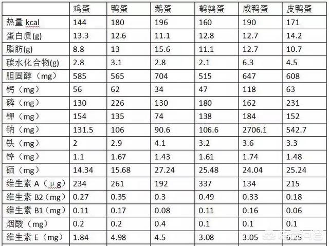 从这个表中可以看出,鹅蛋富含蛋白质、脂肪、碳水化合物、胆固醇、钙、磷、钾、钠、铁、锌、硒、维生素A、维生素B2、维生素B1、烟酸、维生素E。