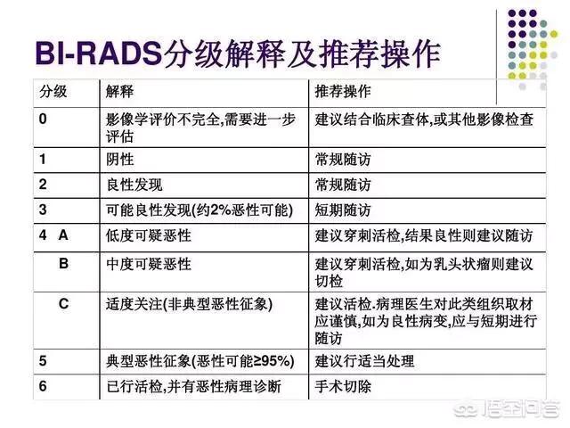目前乳腺报告都是采用BI-RADS分级,国内外都通用。分为0-6这7级,越往上越不好。上了4级,就要干预处理了。记清楚这7个分级,以后自己的报告,自己心里有数,才能更好的了解自己的乳腺。