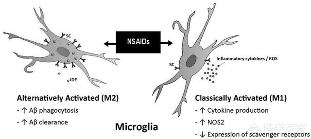 上图:非甾体类抗炎药(NSAIDs)对小胶质细胞两种激活模式导致炎症的抑制作用示意。小胶质细胞的过度激活会导致不受控的炎症,从而使老年痴呆症恶化。小胶质细胞的两种激活过程中,非甾体类抗炎药都能起到抗炎抗淀粉样蛋白形成的效果。(资料及图片来源: