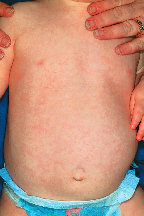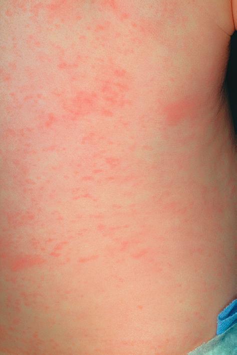 知道差不多是幼儿急疹了,那就好办了,等皮疹出现吧,一般皮疹会在颈部和躯干开始出现,逐渐蔓延到面部和四肢,可在24小时内出全;皮疹表现为压之可褪色的斑疹或斑丘疹(突出皮肤表面)。皮疹一般情况下不痛不痒,通常持续1-2日,少数在2-4小时内短暂出现后旋即消失。