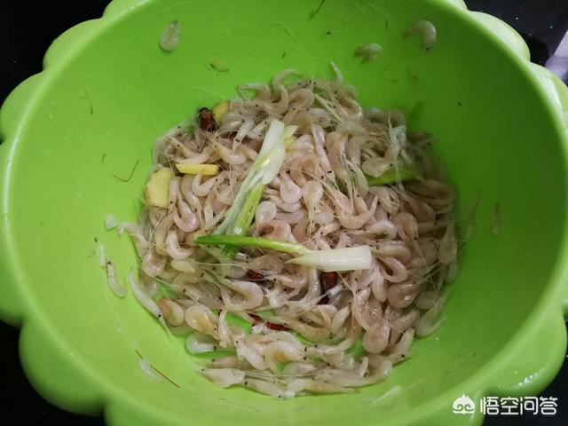 这些所谓的河虾和小时候在河里捉的河虾完全不能比。以前的河虾触须长,前腿发达发灰还比较长。唉!迁就着吃吧!将虾米清洗干净加葱姜,料酒,盐腌制十五分钟。