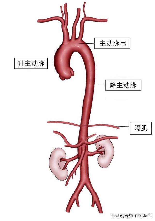 如下图所示:是人体主要的大动脉,在这个大动脉中会分出很多的分支动脉,比如肾动脉供应肾脏的血管,腹腔干供应腹腔的血管。在这里不做具体的展开。