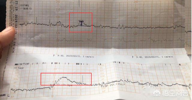 下面的一条线表示胎内宫压,如果在宫缩时,胎心音的节奏忽快忽慢,超过160次/分,或低于100次/分,都是不正常的。