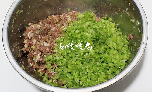 芹菜的选择上我更偏爱细细的西芹,相对来说西芹的芹菜味道略淡一些,接受度更高。普通的芹菜做馅的话很多人会选择用水炸一下,但用西芹则完全不需要!西芹梗和叶子一起切成细丁,同调味后的肉馅搅拌均匀,然后快速的调入一大勺香油,将西芹同盐分接触后出的水分包裹到肉馅内,这样肉馅吃起来会更加的鲜嫩多汁,有着西芹的清新香而不腻!