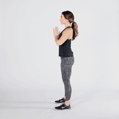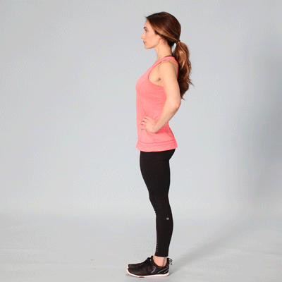 ●迷你蹲:这个动作可以说是锻炼髋部周边肌肉比较好的动作了,做这个动作的时候,一定身体要站直,双脚要与肩同宽,开始锻炼的时候可以扶住一把椅子,大家切记做这个动作的时候背部一定要挺直,可以对着镜子做这个动作,随着膝关节的屈曲慢慢的下降身体,大家做这个动作不要以为就是简单的向下蹲,这是错误的感受,一定要有一个什么样的感受呢?就是用臀部向后方找椅子。在做这个迷你蹲的时候,膝关节才不会超过脚尖,不会增加膝关节的负担,而是单纯的锻炼髋部的肌肉。大家可以好好的看下面这个动图,发现其中的细节,一般我们建议练习这个动作4~6次就可以了,慢慢的可以逐渐增加到12次,不需要过多。