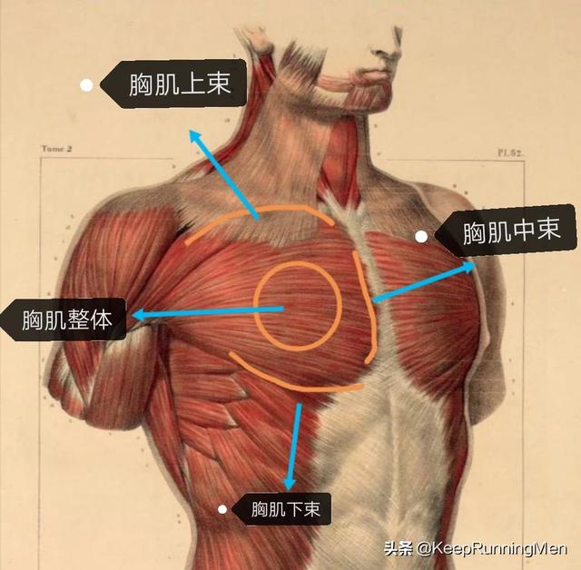️虽然我们胸大肌看上去是一整块,但是根据肌肉纤维走向与起止点,我们把胸大肌功能区域分为胸肌上束,胸肌中束,胸肌下束!