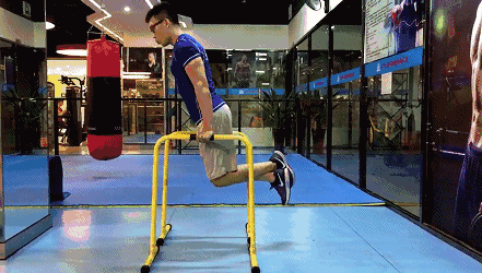 1.双手撑在双杠上,撑起身体,背部挺直!