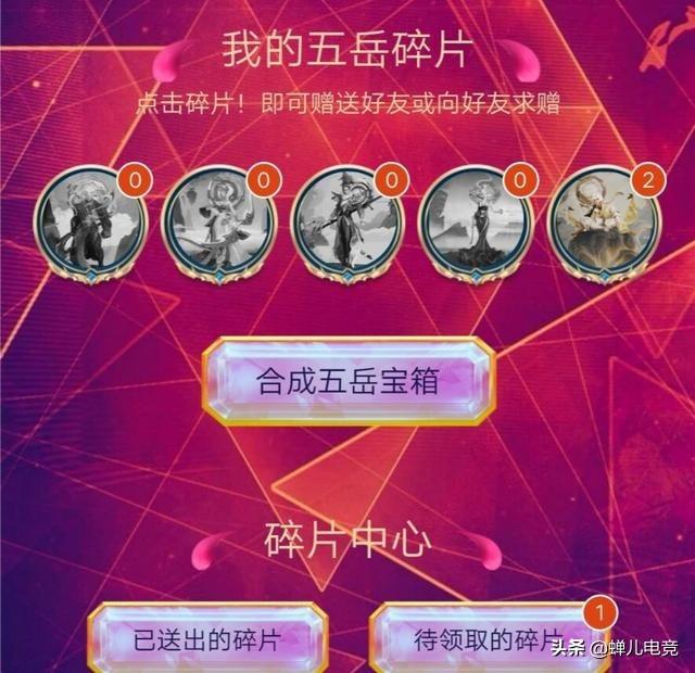 除此之外还有一个全新的福利活动上线,这个福利活动的奖品是十分丰富的,玩家可以兑换五岳皮肤,最低的奖励也是随机红包。这个活动只能QQ区玩家参加,可以说是QQ区玩家的专属福利活动。任务就是收集五岳碎片,这个就比较类似于支付宝的集五福,获得多余的碎片可以赠送好友,如果说缺少的碎片也可以向好友求赠!这对没有购买五岳皮肤的玩家来说可是一个天大的福利,一定要把握机会进行参加!