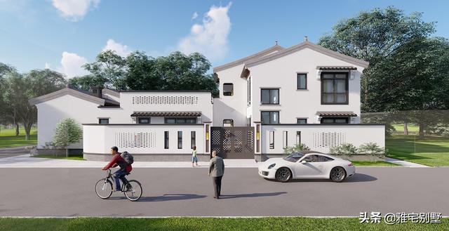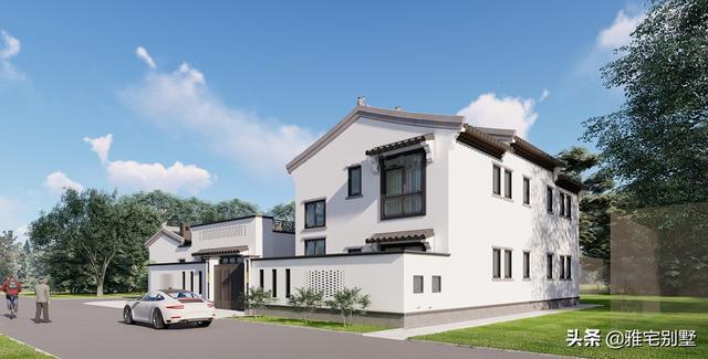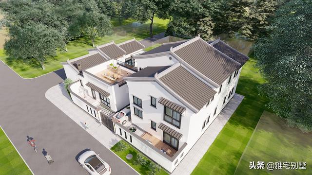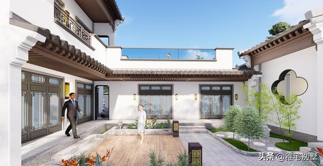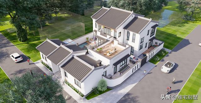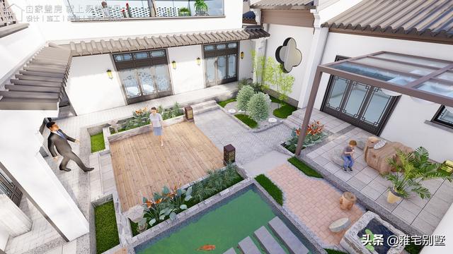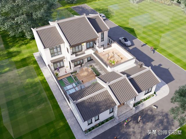房屋前低后高,层次丰富,阳台与露台相结合,院内布置水景凉亭,绿植点缀,青砖铺地,十分精致耐看。