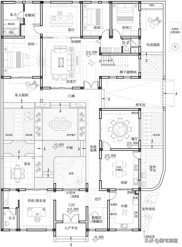 一层南侧入户,入户设计门厅作为过渡空间。西侧布置一间书房兼娱乐室,带独立卫生间。东侧布置中厨,与西厨相连,餐厅靠东侧,可同时看到两个不同的院落景色。主楼布置在北侧,两层格局。入户是会客厅,结合茶室形成开放式布局,南北通透,通风采光效果显著。一层设计3个卧室,靠东一侧有独立的庭院。房屋整体围绕中间的生活庭院布局,院内有半开放的茶室,室外活动平台,水景与绿植点缀其中。