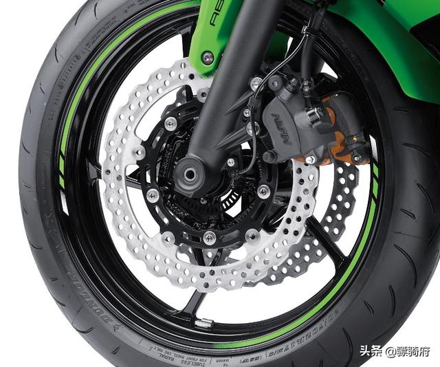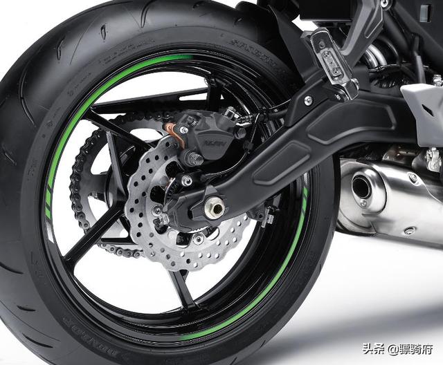 川崎NINJA650采用的是前正立前叉,前制动系统为双活塞轴向式卡钳,后制动系统为单活塞卡钳,轮胎规格为前120/70 - ZR17 M/C(58W),后轮胎为160/60 - ZR17 M/C(69W),后摇臂为钢质。