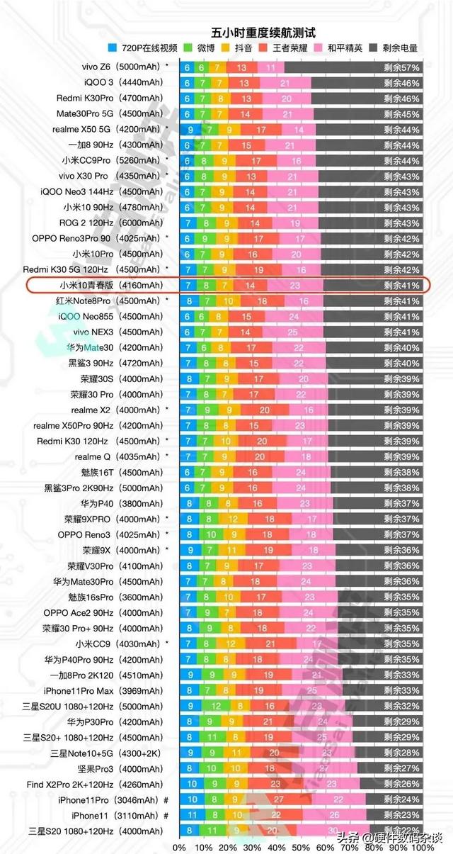 5、电池容量与快充部分:小米10青春版为4160mAh容量以及22.5W充电功率,而红米K30 5G版采用4500mAh容量以及30W快充功率。虽然红米K30电池容量更大,但是由于是功耗更大的120HZ刷新率LCD屏幕,相较于小米10青春版的AMOLED屏幕更为耗电,导致续航能力上反而小米10青春版更为出色。
