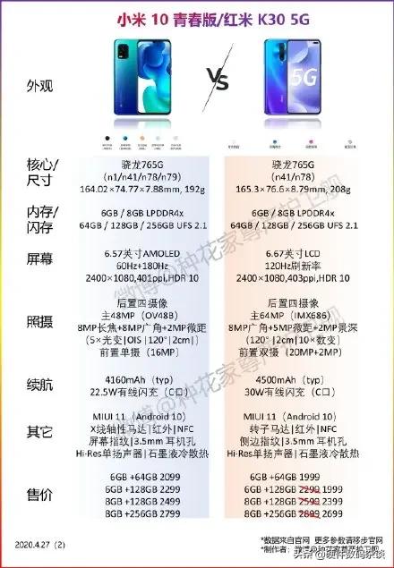 我们接下来再看一下小米10青春版和红米K30 5G版的差异: