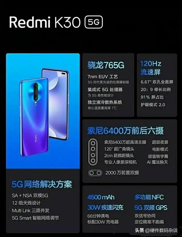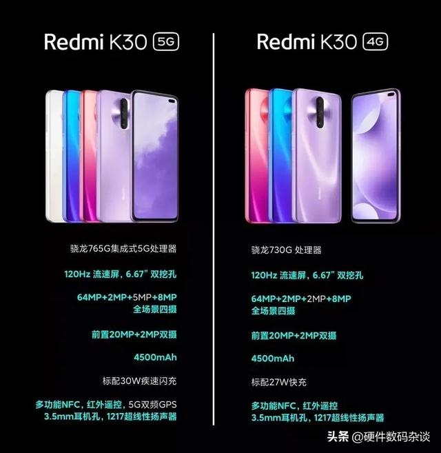 我们接下来从硬件配置方面对三款手机进行对比说明,先看如下红米K30 4G版与5G版差异: