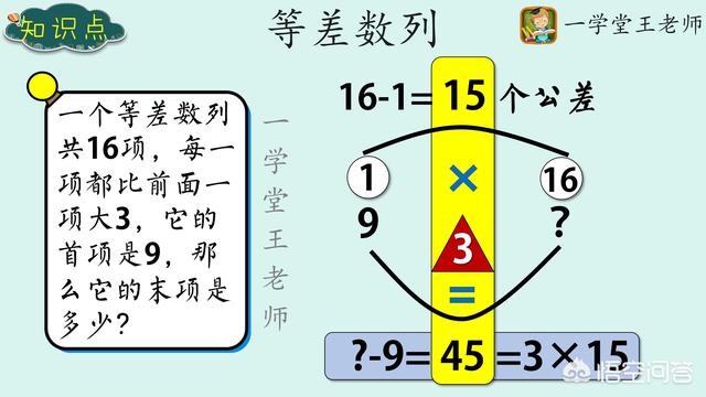等差数列有求公差,求某项,求项数等题型。最主要让孩子理解等差数列的两项差等于两项之间的公差数乘公差,王老师教孩子画图的方法解等差数列大部分题型,只要画出怪物图就可以解题,不用记公式,学生比较容易掌握和运用。