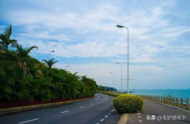 厦门环岛路全程31公里,路宽44~60米,为双向6车道,绿化带80~100米,是厦门市环海风景旅游干道之一。环岛路的建设一直奉行“临海见海,把最美的沙滩留给百姓”的宗旨,有的依山傍海,有的凌海架桥,有的穿石钻洞,建设起点高,标准严,充分体现了亚热带风光特色。通过近47万平方米的绿化、小品等充分体现了亚热带风光,体现了厦门特色,形成了一条集旅游观光和休闲娱乐为一体的滨海走廊。展现在人们眼前的是一幅蓝天、大海、沙滩、绿地和四季花开不断的美好图画。环岛路将依据现有地貌,海滨沙滩、历史文脉,从“人、自然、生态”的理念出发,上下行分幅设计,中间和两侧各留50—150米的景观分隔带和防风林带。
