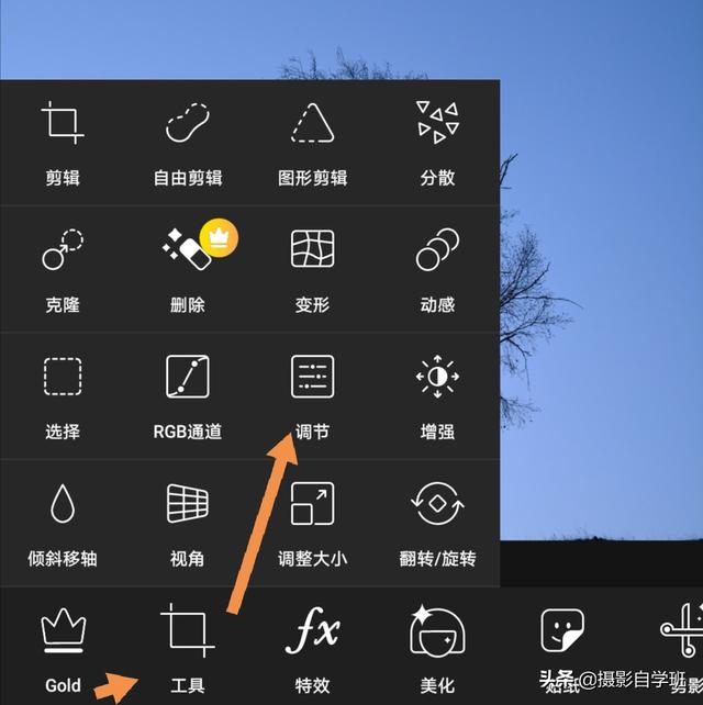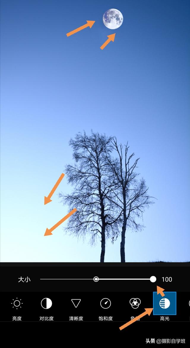 (4)我们再通过调整,让月亮看起来更亮,点击页面下方的工具,在工具中选择调节,在调节中,选择高光,把高光提高到最高,这时候我们会发现月亮变亮了,但是照片的左下角也已经过曝了。所以: