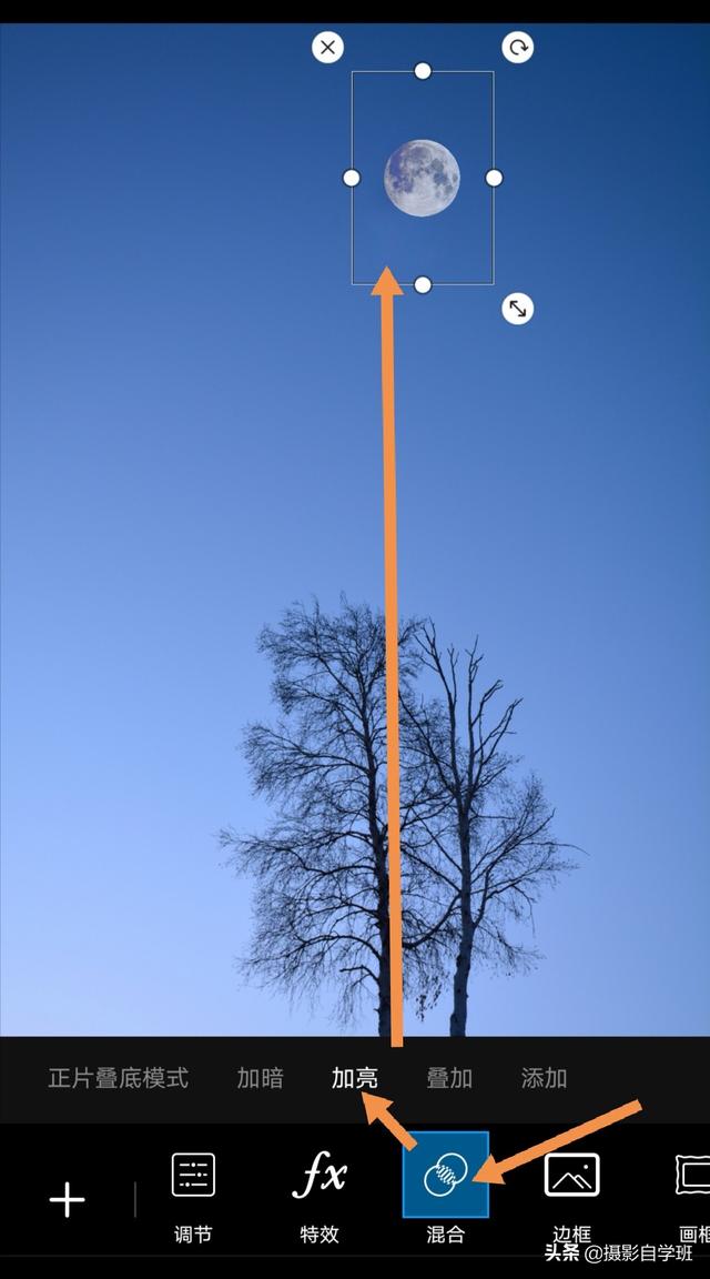 (2)点击页面下方的添加照片,把在手机中准备好的月亮素材,添加进来,点击页面,下方的混合,在混合模式中选择加亮,就可以让月亮单独显示出来了。