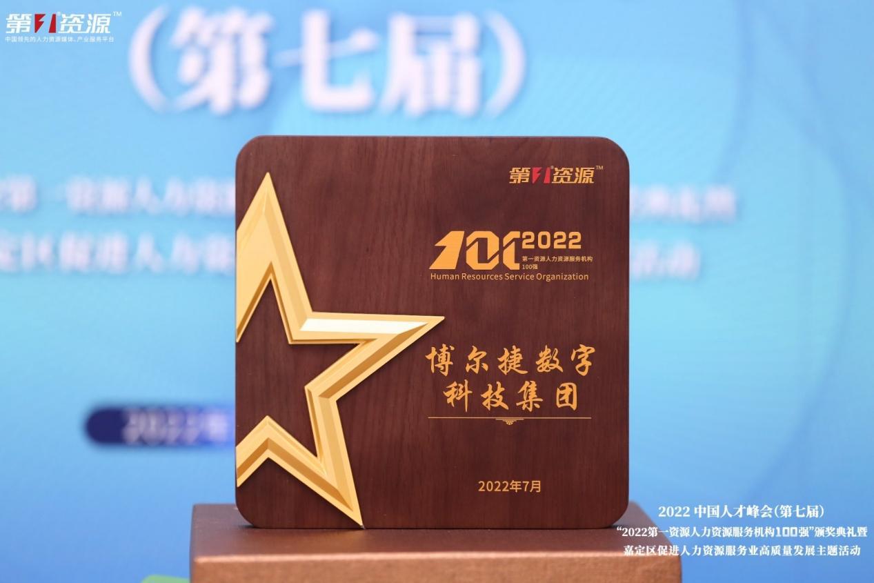 2022年7月8日,2022中国人才峰会(第七届)“2022第一资源人力资源服务机构100强”颁奖典礼在在上海•嘉定成功举办,博尔捷数字科技集团凭借数字化人力资源技术和品牌影响力荣获百强企业。