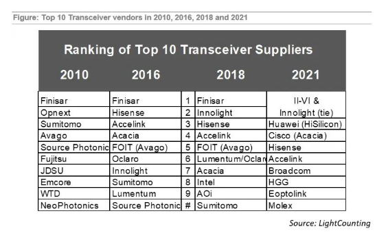 据此前光通信行业知名市场调研机构LightCounting发布最新一期的市场报告显示,国内光模块厂商表现出色在今年占据了全球60%的市场份额,全球前十名的厂商中有6家来自中国,且Innolignt旭创科技位居第1。LightCounting报告预测,受益于5G建设、数据中心建设,下个10年,国内光模块企业必将占据更大的份额。