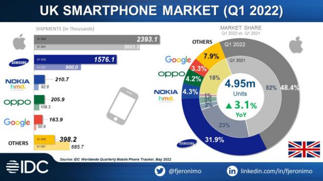 IDC:苹果iPhone是英国手机销量之王,三星、诺基亚、OPPO、谷歌挺进前五