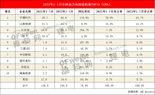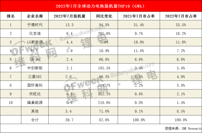 7月全球动力电池TOP10企业分别是:宁德时代、比亚迪、LG新能源、松下、SK On、中创新航、三星SDI、国轩高科、欣旺达、蜂巢能源。