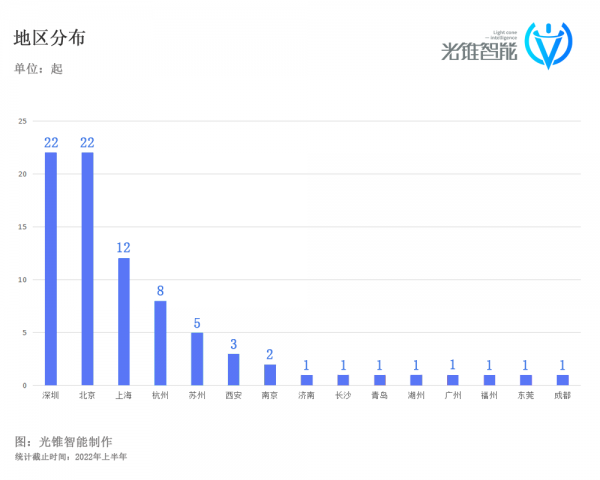 从时间维度上来看,2022上半年,融资事件的峰值出现在6月,发生18起,5月融资数量最少,仅为6起,平均每月发生13起融资事件。