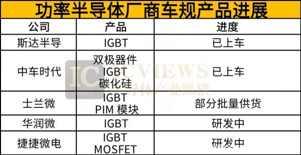 除了造车新势力,国内传统功率半导体大厂也选择在汽车功率半导体赛道上深耕,如斯达半导、中车时代、士兰微等,这几家企业都已经正处于快速市场化阶段。