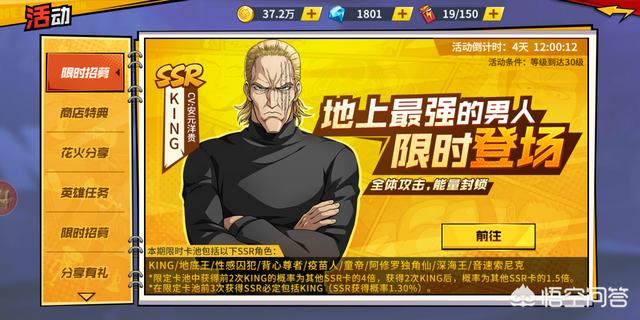 现在,《一拳超人》官方手游貌似形成了一个惯例,那就是每到月初的时候,游戏运营商便会推出一名全新的SSR角色。在7月初,官方推出波罗斯;而到现在的8月初,官方推出了King。其实,不管是波罗斯,还是King,官方所推出新角色时的活动都相差无几。比如说:在最近的一段时间中,官方将奖励活跃的玩家限时招募券。不过,零星的几张限时券对于抽取King来说,根本就是杯水车薪。