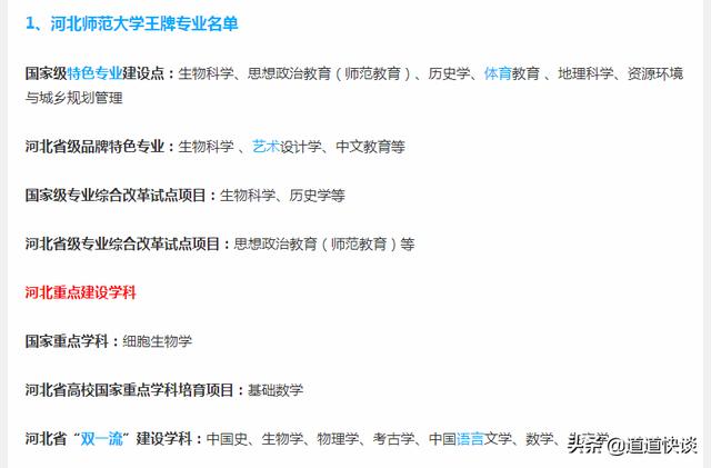 河北师范大学2011年搬到了新校区,原来的校区成为汇华学院(独立学院)所在。河北师范大学最好的专业以师范类居多,当然,它也有非师范类专业的。它的数学、生态学、中国语言文学、马克思主义哲学实力比较强。在第四轮学科评估中,它的马克思主义理论、中国语言文学、数学、生态学获评B;体育学、物理学、生物学获评B-;教育学、考古学、中国史、地理学、美术学获评C+;外国语言文学、化学、音乐与舞蹈学获评C;哲学、心理学、世界史、艺术理论学4获评C-。下图是它的王牌专业名单,大家可以参考。