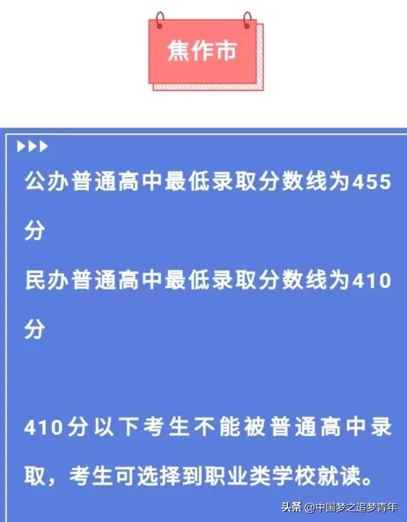 6.焦作,公办高中最低录取分数455分,民办410分,实际上普通高中最低控制线为410分。