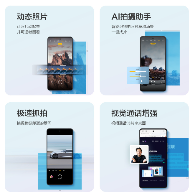ZUI 14 在影像软件方面也进行了提升,包括动态图片、AI 拍摄助手、极速抓拍、视觉通话增强等。