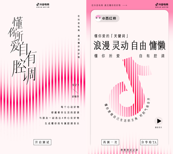 抖音电商为本次好物节专门打造了一款H5,让用户在一连串富有腔调标签的商品中选择自己的心仪好物,生成个性结果页,在二次传播中还能基于标签形成remix音乐,将页面分享给朋友,朋友也可以反过来帮你选择,友谊就在互相“懂你”和种草中升华。抖音电商不仅自己“懂你”,还让身边的人来一起“懂你”,进一步在用户的社交圈中渗透“遇见懂你的好物”。