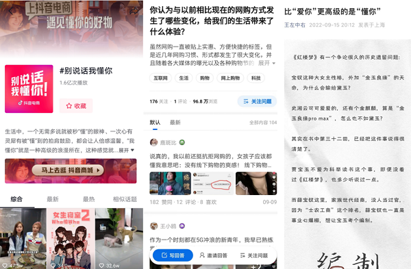 在线上,“别说话我懂你”这一活动话题和在抖音电商上的购物体验也迎来了一大波 KOL的热情讨论。知乎热议话题“你认为与以前相比现在的网购方式发生了哪些变化,给我们的生活带来了什么体验?”中,数以百计的知乎用户提到自己被抖音电商“懂到了”,有人选礼物不再只有常规的茶、烟、酒,而是在抖音电商的帮助下挑选到了更让收礼者满意的贴心礼物;有人以前只点赞收藏运动短视频,则被抖音推荐了运动鞋、护膝,逐渐走上了每日运动打卡的道路。此外,著名大V王左中右以一篇《比“爱你”更高级的是“懂你”》直戳年轻人的“敏感点”,直呼自己又“被懂了”。抖音电商的兴趣购物模式正在切实地改善人们的消费体验,让美好生活触手可得。活动期间,还有多位达人在抖音、微博等各大平台分享了“别说话我懂你”的参与体验。多管齐下,为抖音电商带来一大波热度和转化。