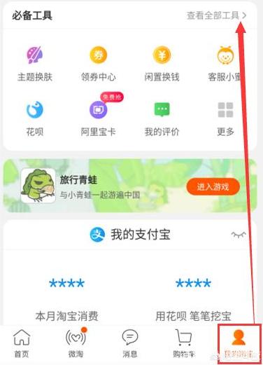 第一步:我们想在手机淘宝开店,首先需要打开手机淘宝,然后登录自己的淘宝账号,然后点击右下角“我的淘宝”,然后再点击“查看全部工具”,如下图所示:
