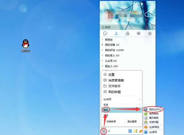 3、在弹出的QQ主菜单的下拉选项中,点击帮助中的“我的qq中心”;