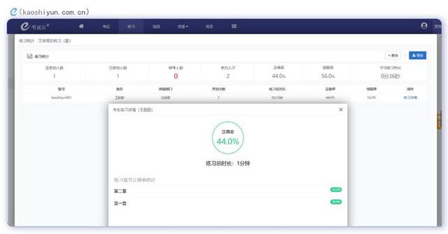 在练习结束后,系统将自动统计汇总了练习的参加人数、参加人次、正确率、错题率以及整场练习的平均练习时长,并将每个考生详细练习情况一一展示。